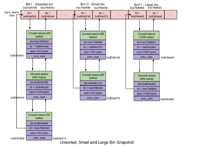 注意同一个 bin 中的 chunks 不是相同大小的,按大小降序排列。这和上面的几种 bins 都不一样。而在取出 chunk 时,也遵循 best fit 原则,取出满足大小的最小 chunk。