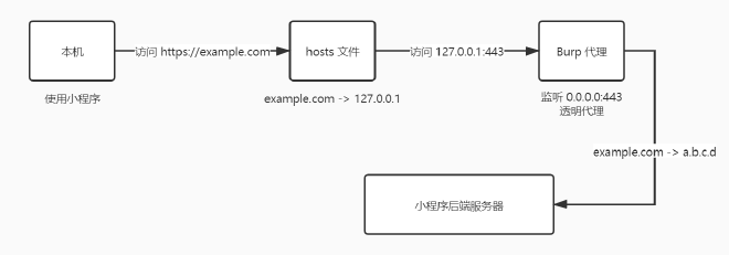 Proxy -> Options -> Proxy Listeners将代理服务器设置为监听所有网卡(All Interfaces),端口 443,并开启透明代理(Support invisible proxying)。Project Options -> Connections -> Hostname Resolution中手动设置域名解析,将example.com解析到a.b.c.d。