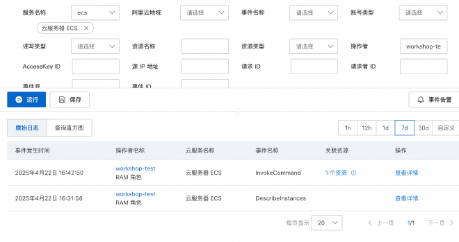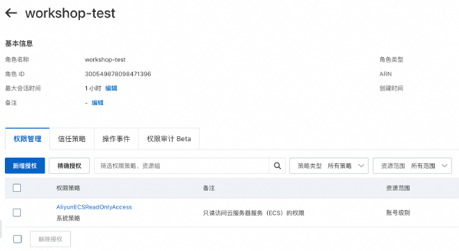 新建 RAM 用户 workshop,授予以下权限,供防守方人员登录: