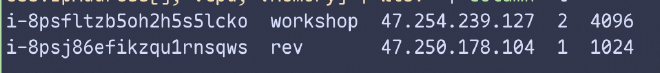 aliyun ecs DescribeInstances | jq -r '.Instances.Instance[] | [.InstanceId, .InstanceName, .PublicIpAddress.IpAddress[], .Cpu, .Memory] | @tsv' | column -t