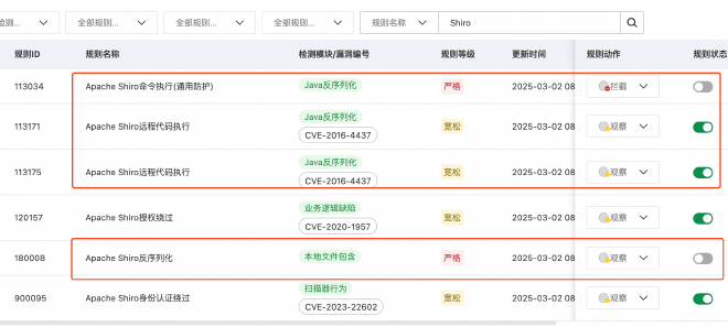 在 Web 核心防护规则中,将本次攻击利用漏洞相关防护规则设为关闭或观察模式: